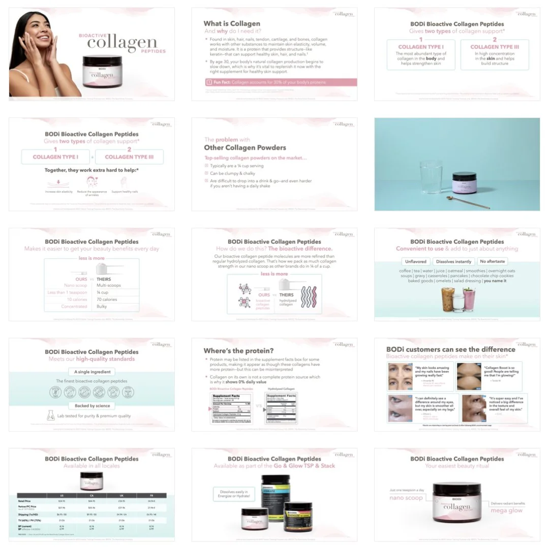 A compelling and informative presentation deck for BODi Collagen, incorporating custom iconography, professional photography, and multimedia elements. The deck showcases key product features, testimonials, and pricing, enhancing the brand’s marketing strategy.