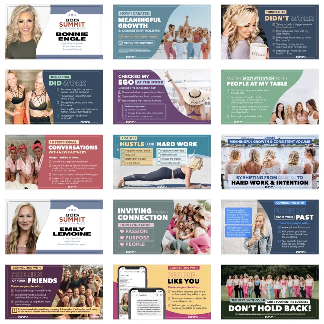 Highlighting two presentations from a series of over 40 created for BODi Summit 2023. These presentations were tailored to enhance partner engagement and learning, featuring clear visuals and strategic content.